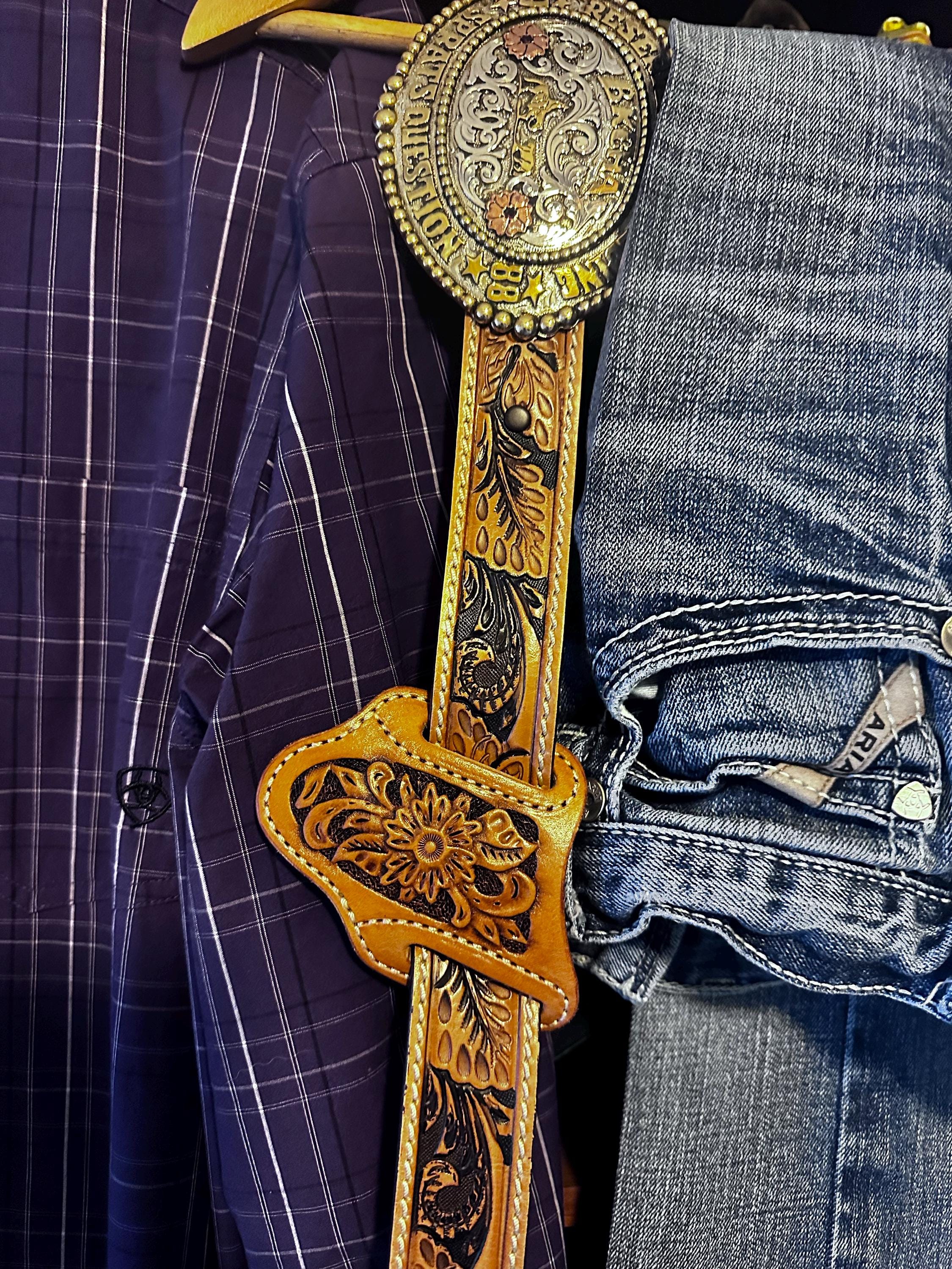An exceptional hand-tooled, hand-made leather knife sheath displays a Western flower design that impresses your family and friends!