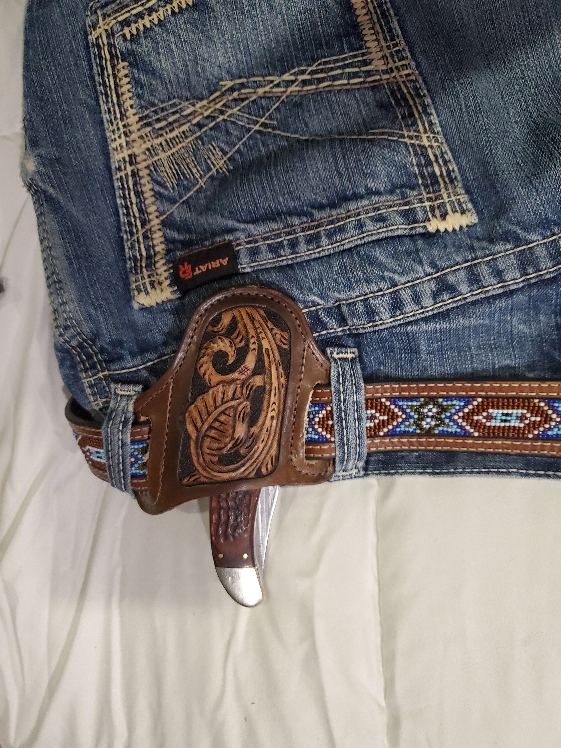 This listing is for a tooled leather pocket knife pancake sheath designed to fit the Buck 110 folding pocket knife. It measures about 5" x 5" and is about 1" thick without the knife. The belt slots will slide onto a 1.5" wide belt.
